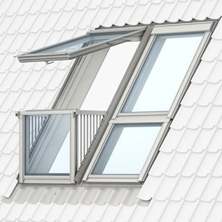 Het ondervenster van de Cabrio opent naar buiten en creëert een klein balkon. Wanneer het onderste Cabrio dakraam wordt geopend, verschijnen automatisch de geïntegreerde balustrade. Het onderste venster van de Combi hellend is een vast element type GIL.