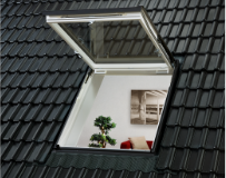 VELUX vluchtvensters met scharnierpunt aan de bovenzijde kunnen traploos worden uitgezet tot 45° ten opzichte van de dakhelling. In noodsituaties kan het venster worden uitgezet tot 67°. Het VELUX vluchtvenster wordt bediend d.m.v. een bedieningshandgreep aan de onderzijde van het draaiende gedeelte en kan worden vergrendeld in een kierstand.